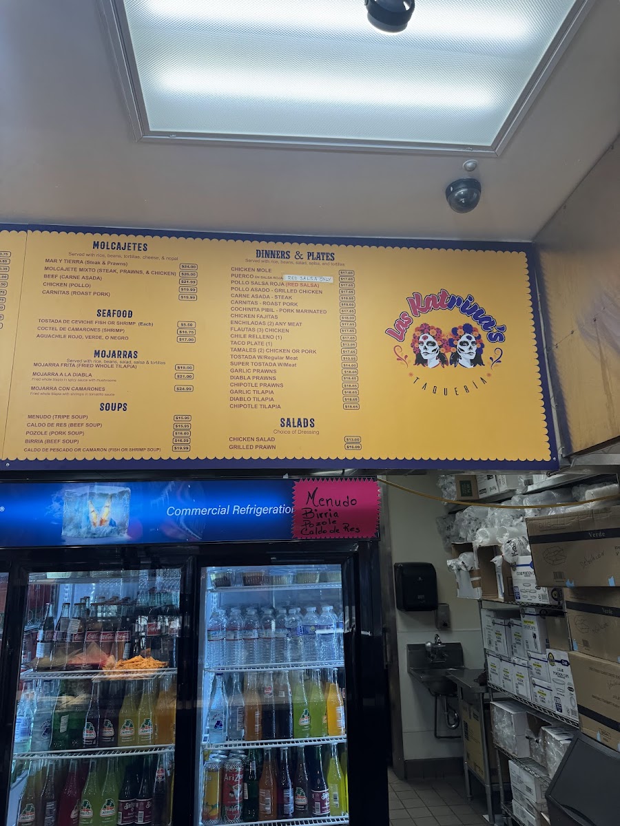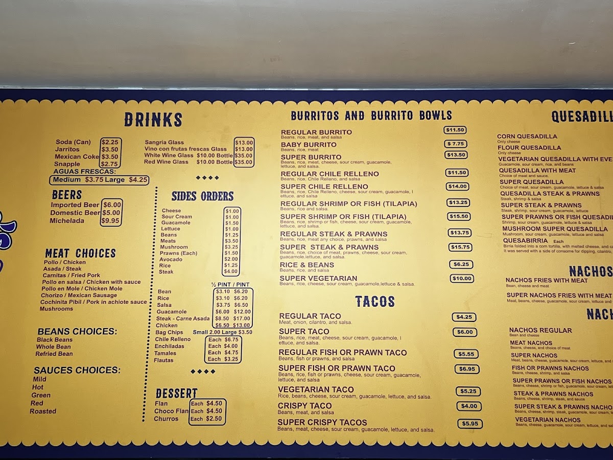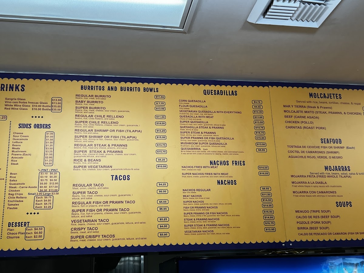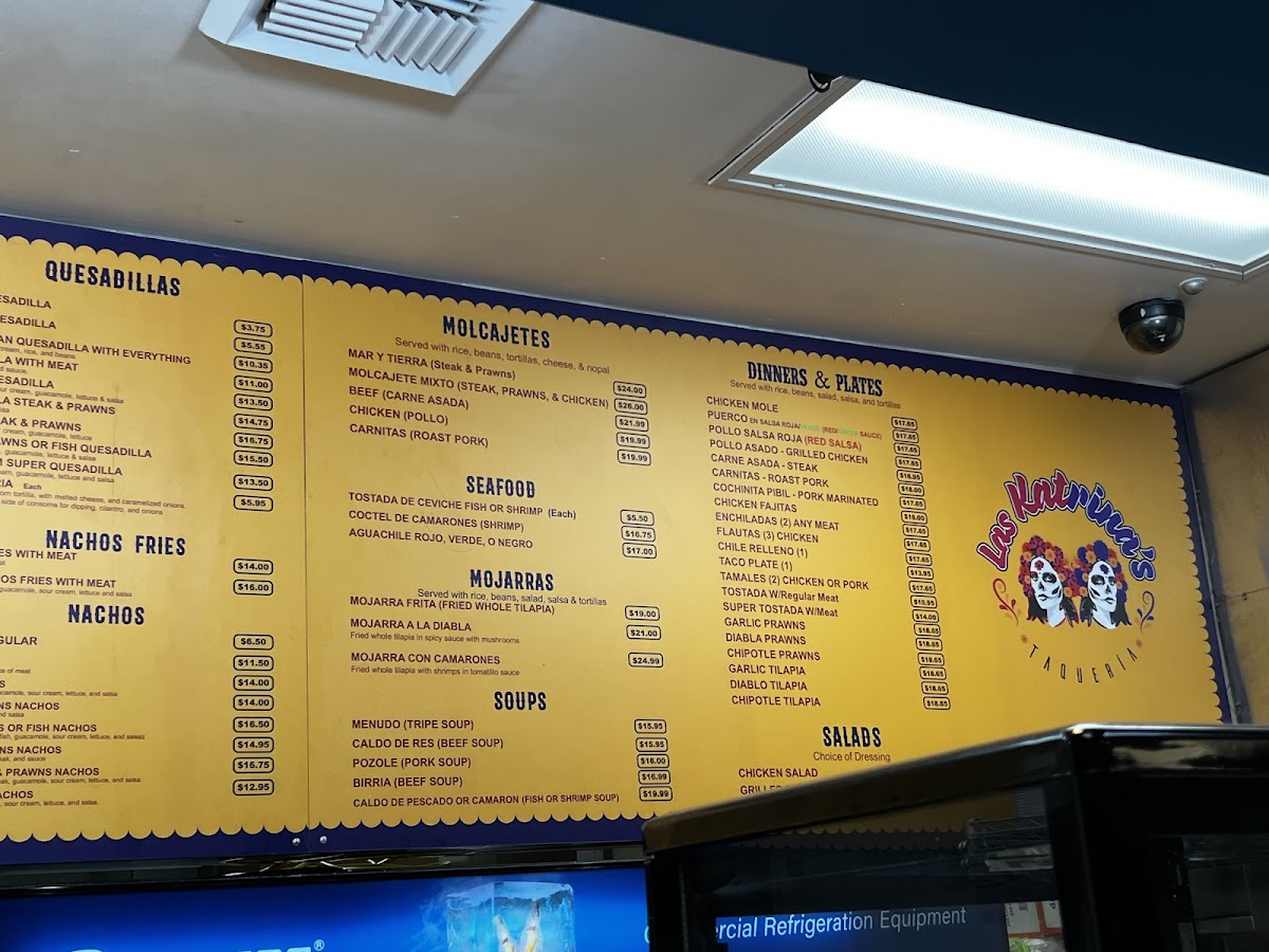 From a reviewer’s perspective, the menu at Taqueria Las Katrinas offers a wide and satisfying selection, ranging from hearty plates to classic Mexican favorites. Highlights include the flavorful Nachos Fries With Meat and Super Nachos Fries With Meat, as well as traditional fish dishes like Mojarra A La Diabla, Mojarra Con Camarónes, and Mojarra Frita / Fried Whole Tilapia. The Burritos & Burrito Bowls section features options such as Regular Shrimp Or Fish (Tilapia), Super Vegetarian, and Super Steak & Prawns, while comforting soups like Menudo / Tripe Soup, Pozole / Pork Soup, Caldo De Res / Beef Soup, and Birria / Beef Soup add authentic depth to the menu. Diners can also enjoy plates like Chicken Mole, Pollo Asado / Grilled Chicken, and Garlic Tilapia, or try the popular Molcajete Mixto / Steak, Prawns, & Chicken. Other favorites include Quesabirria, Super Nachos, Steak & Prawns Nachos, Super Taco (2 Pieces), Regular Taco (3 Pieces), and seafood specialties like Aguachile Rojo, Verde, O Negro and Coctel De Camarónes / Shrimp. To finish, desserts such as Flan, Churros, and Chocoflan provide a sweet ending, making the menu diverse, filling, and well worth exploring.
